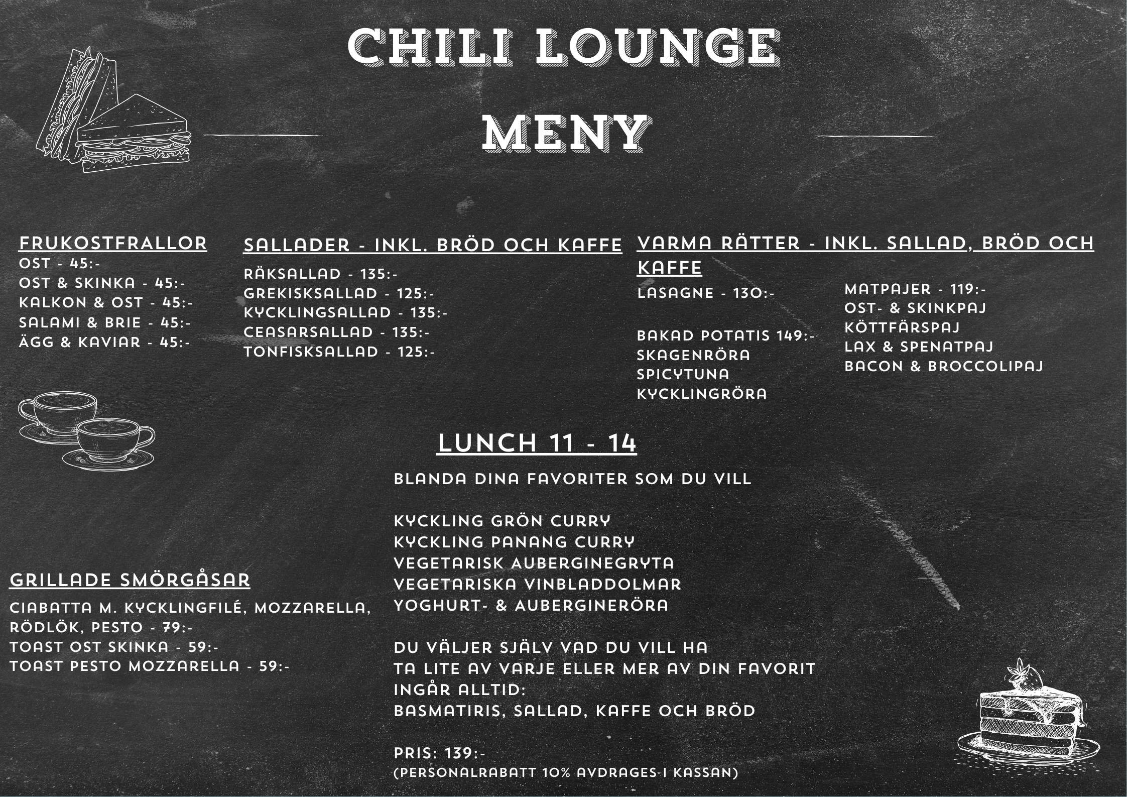 På Chili Lounge erbjuder vi en varierad meny med något för alla smaker. Vare sig du är ute efter en snabb fika eller en mättande lunch, hittar du något hos oss. Vi prioriterar fräscha råvaror och hemlagade rätter, alltid med en modern twist och en hemtrevlig känsla.